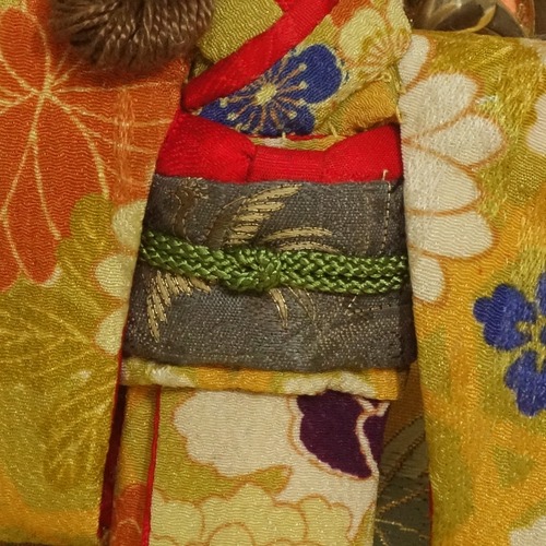 着物は大正縮緬の正絹古布を使用し手縫いで作成しています。