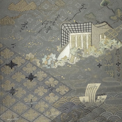 帯は大正時代の帯地で、鈍色(にびいろ)地に鳳凰、桜などが描かれています。