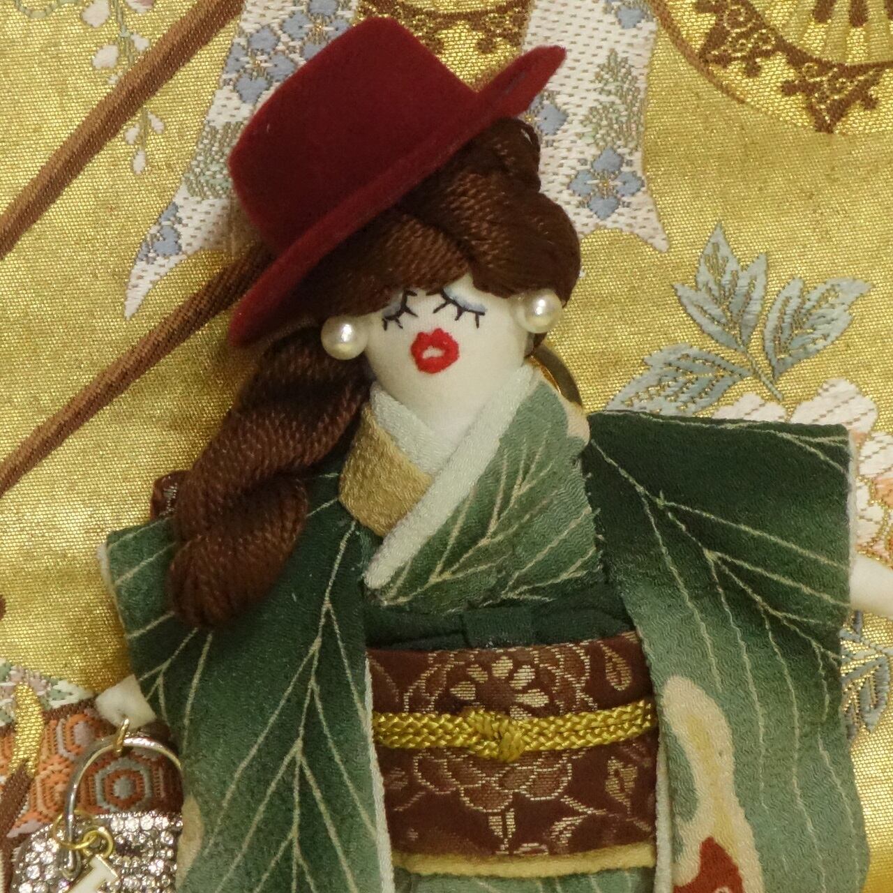 着物は大正縮緬の正絹の古布を使用し手縫いで作成しています。